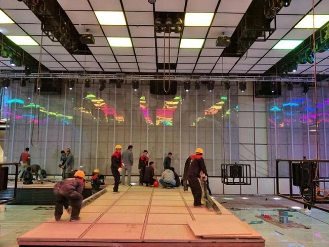 12月15日,整个透明屏项目搭建调试时间不足三天!时间紧、任务急、工期短,面积大,又正值周末休息期间,LCF视觉创造团队面临着前所未有的挑战。远在海外的企业创始人龙平芳女士运筹帷幄,当机立断,下达指令。由业务部、采购部、制造部、工程部、品质部相关负责人组成协调小组,高效配合,分工确责,组成以业务部为中心的突击队赶赴现场。